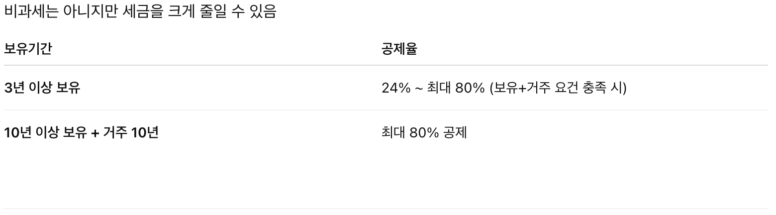 비과세 요건에 해당되지 않더라도 장기보유특별공제 등으로 세금을 줄일 수 있으므로 반드시 신고 전에 전문가 검토 권장