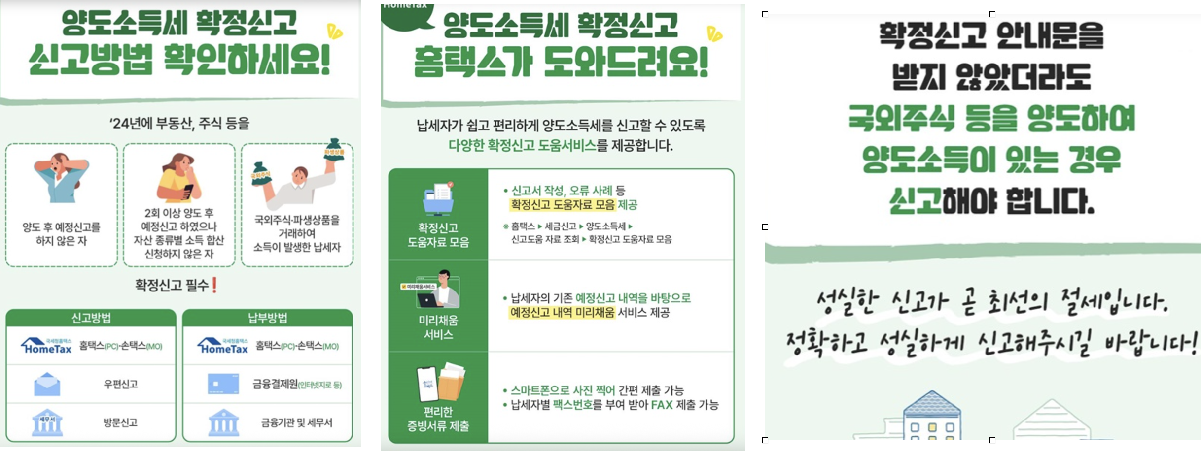 2024년 한 해 동안 부동산, 주식 등 자산을 양도한 납세자 중 다음에 해당하는 경우, 2025년 5월에 양도소득세 확정신고를 반드시 해야 합니다.