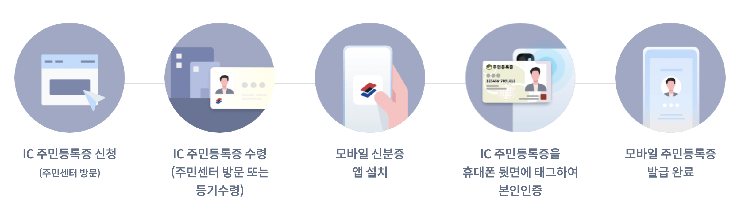 먼저 주민센터에 방문하여 신청서를 작성하고 신분 확인 절차를 거친 후 모바일 신분증 앱을 설치합니다. 이후 앱에서 본인 인증을 진행한 뒤, 주민센터에서 제공하는 1회용 QR코드를 촬영하면 모바일 주민등록증이 발급됩니다.