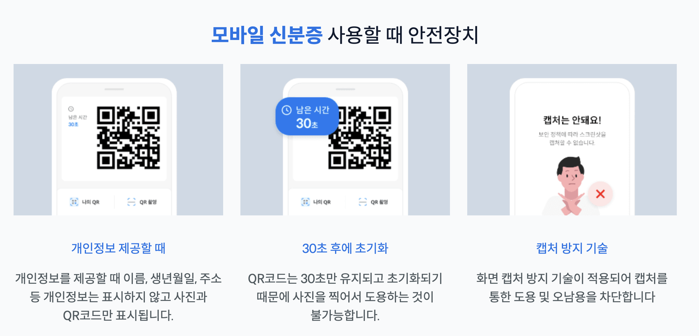 기존의 실물 신분증은 모든 개인정보가 한눈에 노출되는 방식이었습니다. 반면 모바일 신분증은 내가 나임을 증명하기 위한 최소한의 정보만을 선택하여 제출할 수 있도록 설계되었습니다. 이제는 내가 정보의 주인이 되어 언제 어디서나 필요한 만큼만 공유하며 개인정보를 안전하게 지킬 수 있습니다