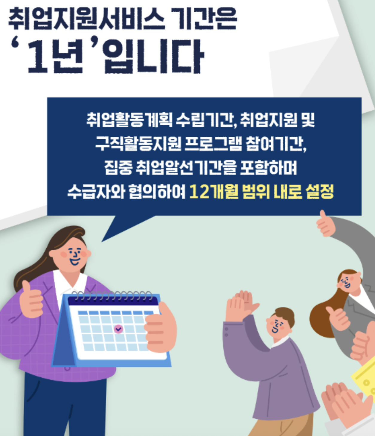 취업지원서비스는 기본적으로 1년이내의 기간 동안 운영됩니다. 이 기간에는 초기 취업활동계획 수립을 포함하여 각종 취업지원 및 구직활동지원 프로그램 참여 그리고 마지막 단계인 집중 취업알선기간이 포함됩니다. 서비스 기간은 수급자의 사정이나 진행 상황에 따라 조정될 수 있으며 필요한 경우 중단이나 재개가 가능하도록 유연하게 설계되어 있습니다.