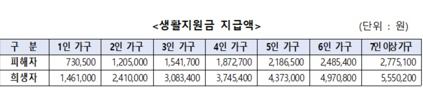 생활지원금의 지급 대상은 희생자가 속한 가구 구성원, 참사로 인해 사망한 희생자의 주민등록상 동일 세대 구성원이 지원 대상이 됩니다.