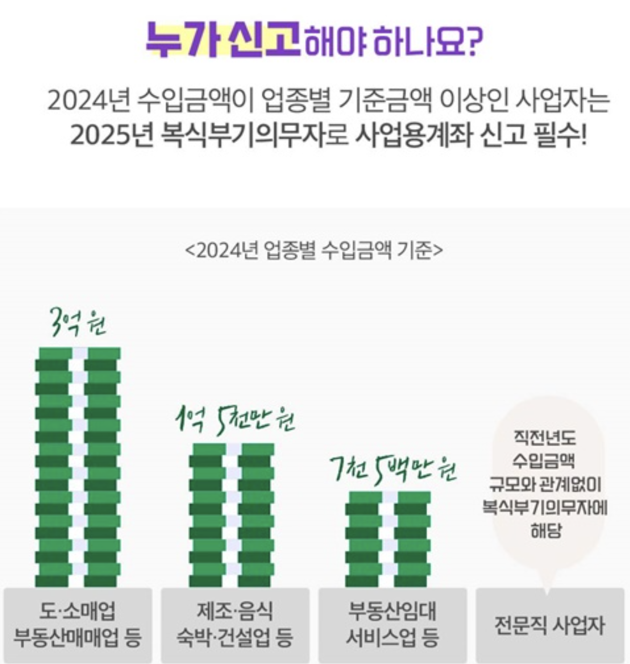 2024년 한 해 동안의 사업 수입금액이 업종별로 정해진 기준을 초과하는 사업자는 2025년부터 복식부기의무자로 분류됩니다.